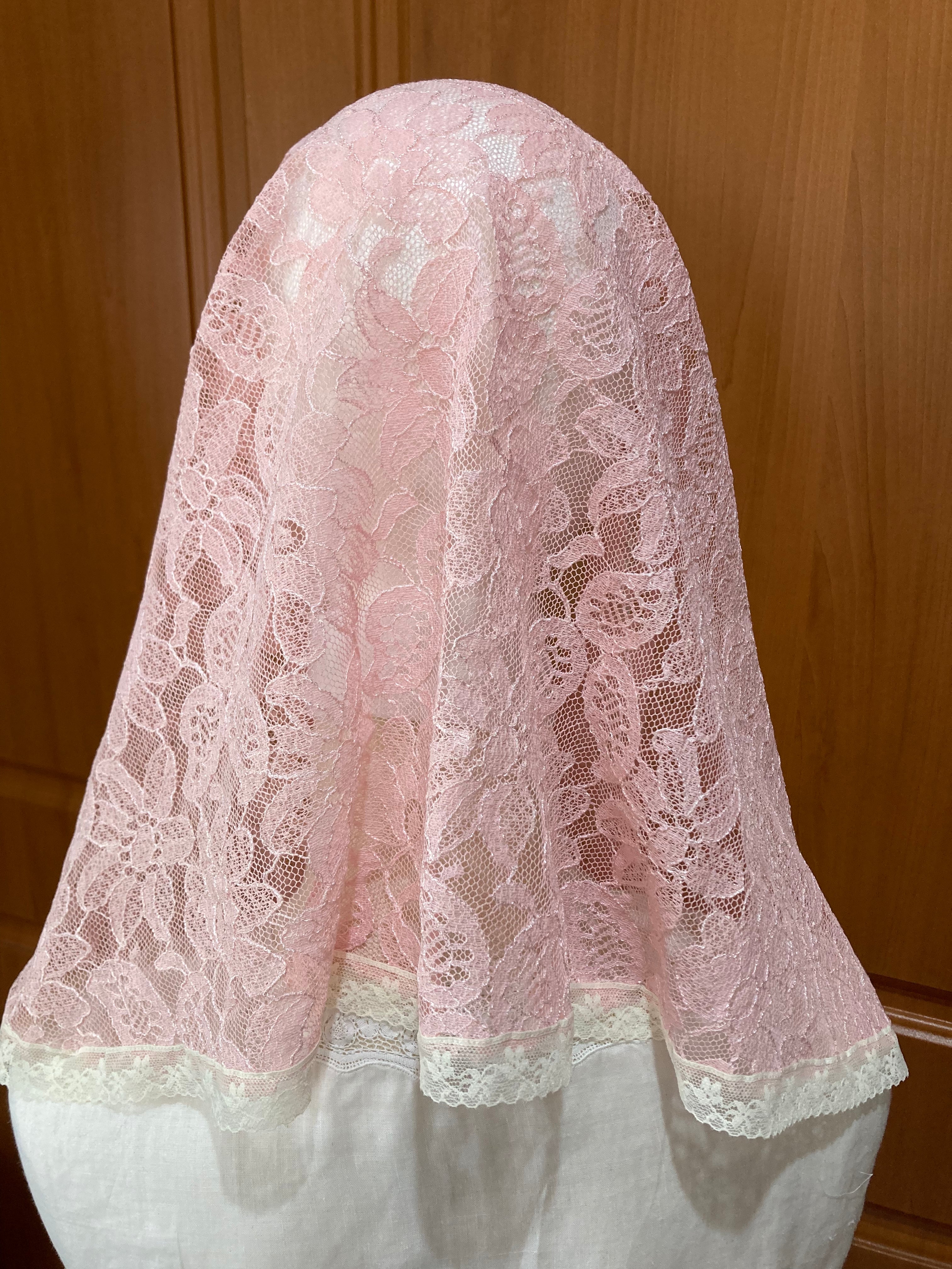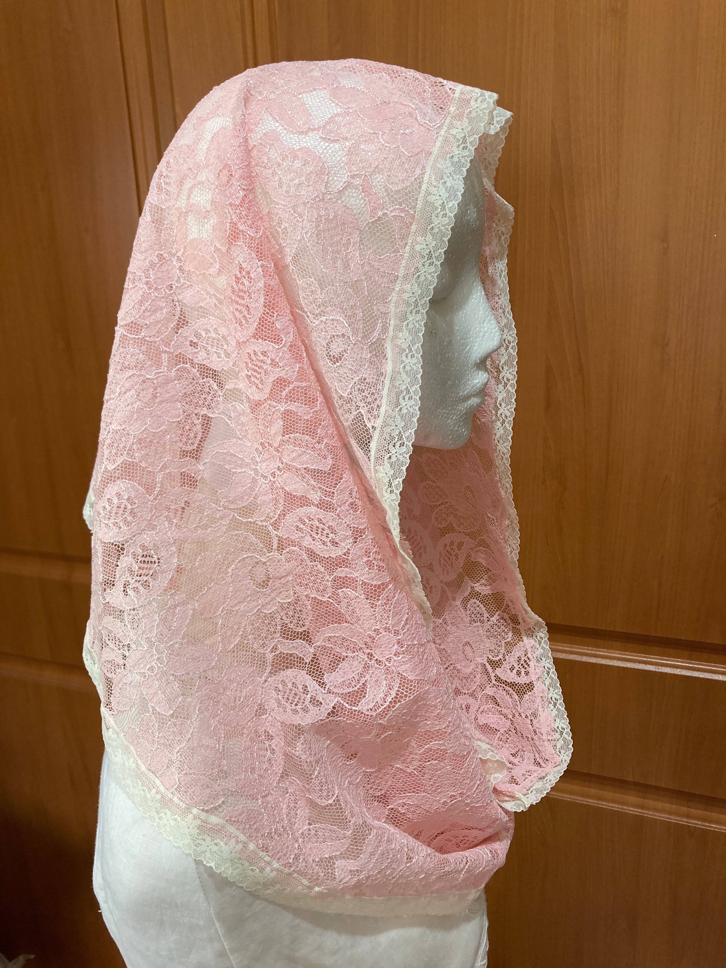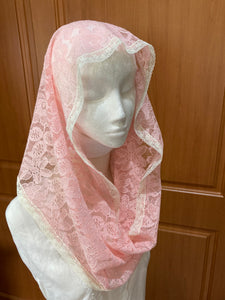 Named in honour of St Agatha, an early Christian Martyr, and patron saint of breast cancer, this pink, floral, infinity veil is finished with a fine lace trim.