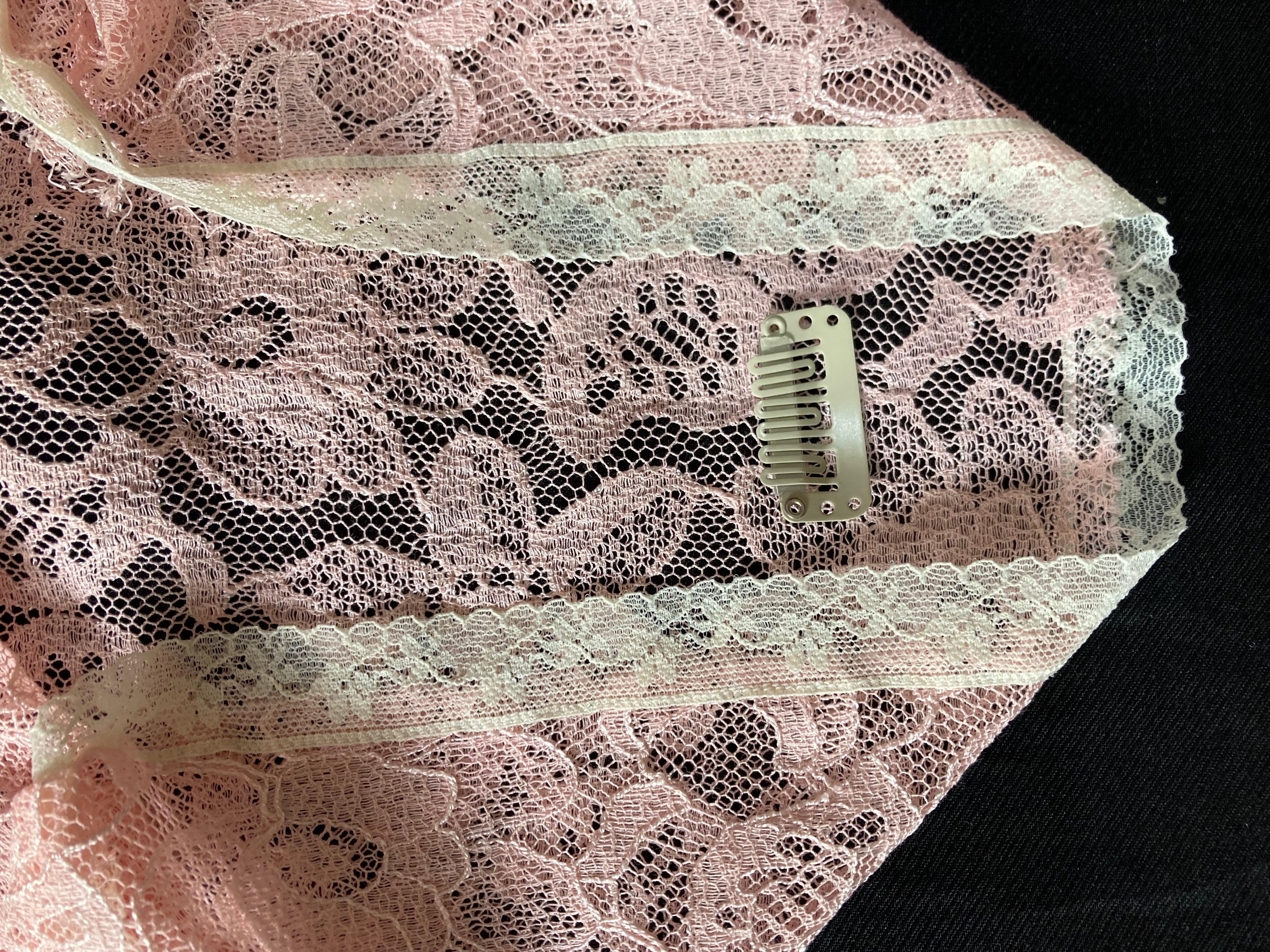 Veil has a sewn in clip to keep it secure. Care instructions included